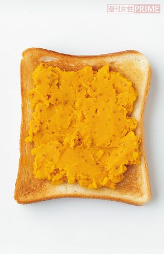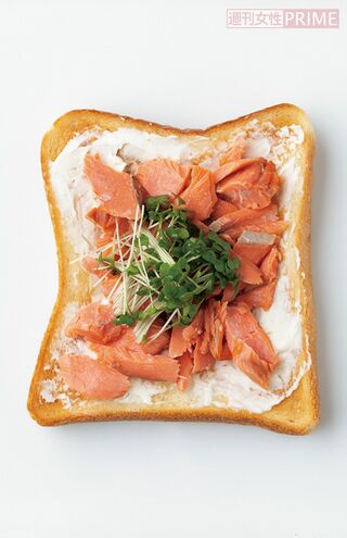 (2)パンはトースターで2分ほど焼き、バター5gをぬりさらに(1)のクリームチーズもぬる。