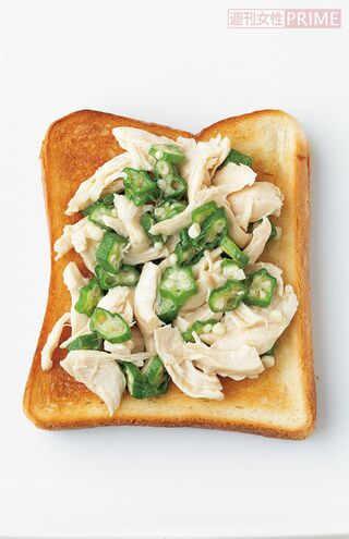 (1)鶏ささみ1本をゆでて、食べやすくほぐす。オクラ2本もゆでて小口切りにする。