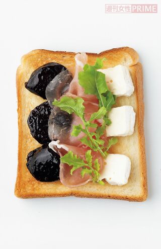 (3)(2)に(1)、プルーン(種ぬき)3個、生ハム小3枚、ルッコラ適量をのせる。