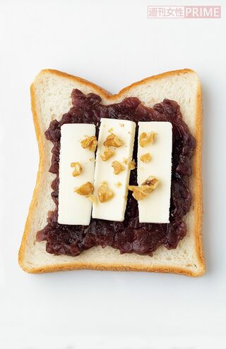 (2)パンにゆであずき50g、(1)をのせてくるみ1個を砕いてちらす。