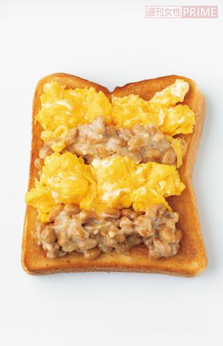 (4)パンをトースターで2分ほど焼き、バター5gをぬり(3)をのせる。