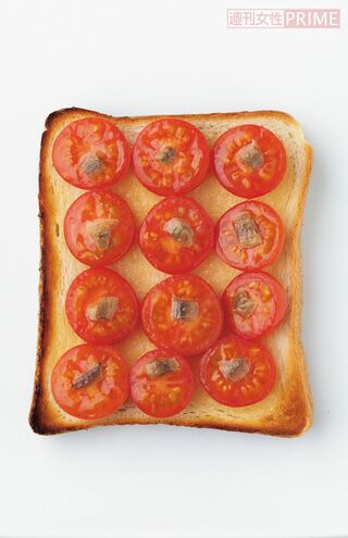 (2)ミニトマト6個は半分に切って(1)に並べ、細かく切ったアンチョビ1切れをのせる。