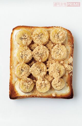 (3)(2)をトースターで4分ほど焼き、きな粉小さじ1をふりかける。