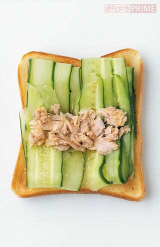 (2)きゅうり1/2本はスライサーで切る。(3)(1)にきゅうりを折り曲げながらのせ、ツナ小さじ2、オリーブオイル小さじ1、塩適量をかける。