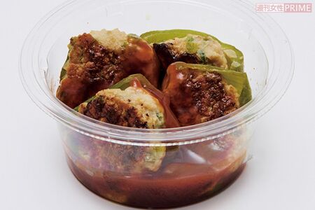鉄板で香ばしく焼き上げたピーマンの肉詰め。「ピーマンがシャキッとしていてうれしい。栄養価的にも優秀」(曽根)、「このままお弁当に使えそう。テリーヌっぽい肉だねはやや微妙」(M)