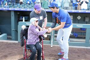 「試合前の練習後、ベンチ前にいた日本人女性にサインボールをプレゼントし、握手をしていました。この女性はユタ州ソルトレークシティー在住で、2月に100歳を迎えた中本ケリー桃代さん。長崎県出身で19歳のときに原爆が投下され、“もう少しで死ぬところだったけど生き残った”と振り返っていました。