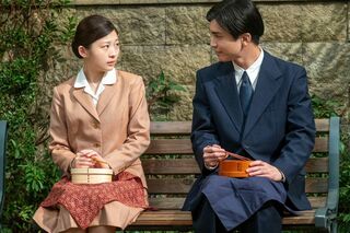 「そっくりさん」になり、ゴザに穴あき軍足を履く比嘉愛未と岩田とMCの浜田(公式インスタグラムより)