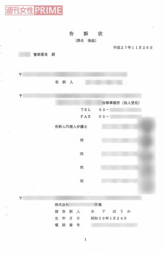 Sさんが弁護士とともに作成した告訴状。木下ほうかの罪名には“強姦”の文字があるが、証拠不十分で受理されず警察も動かなかった