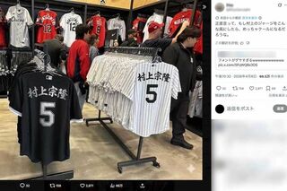 「ダサすぎる」と話題になった村上宗隆のユニフォームのフォントを、現地ファンが毛筆風の行書体に修正(Xより)