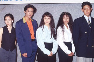 『二十歳の約束』制作発表での集合ショット。左から深津絵里、稲垣吾郎、牧瀬里穂、田中律子、筒井道隆
