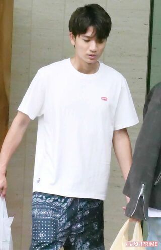 上下合わせて1万円未満のプチプラコーデを着こなす高地優吾。田中樹と談笑する場面もあった